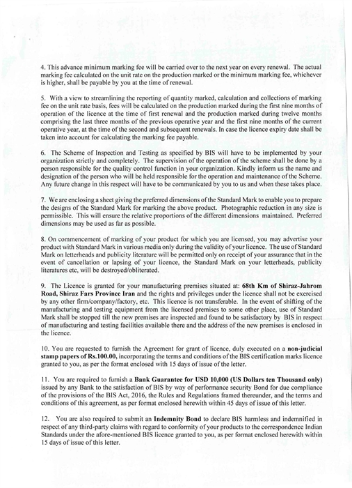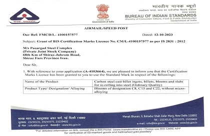 Pasargad Alloy Steel Industries has successfully obtained the BIS standard for its steel ingot products, as detailed in the attached certificate. BIS Institute is one of the largest standard certification companies in the world, which has been officially operating since 1947. BIS is the National Standards Organization of India, which operates under the supervision of the Ministry of Consumer Affairs, Food and Public Distribution, Government of India. The BIS certificate indicates the organization's capability in designing, producing, and quality controlling products according to Indian national standards. This certification confirms that the intended product meets all relevant standards. The Indian government mandates obtaining this certificate for many essential products, including steel products. In fact, this certificate is a prerequisite for exporting products to India, ensuring consumers that product safety and quality have been assessed by a third-party.